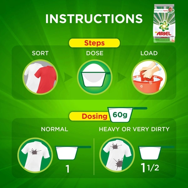 Formulated specifically for fully automatic washing machines, it generates the right amount of foam in the machine to deliver superior cleaning inside the machine itself, without damaging the machine due to excess foam. It requires just 1 scoop for normal loads, and 1.5 scoops for heavy loads, providing performance along with the value. Ariel Matic’s cutting-edge technology provides impeccable cleaning for all your clothes and removes tough stains like juice, chocolate, tomato, and butter/ghee along with maintaining the brightness of the clothes. So now, say goodbye to stains and dullness!